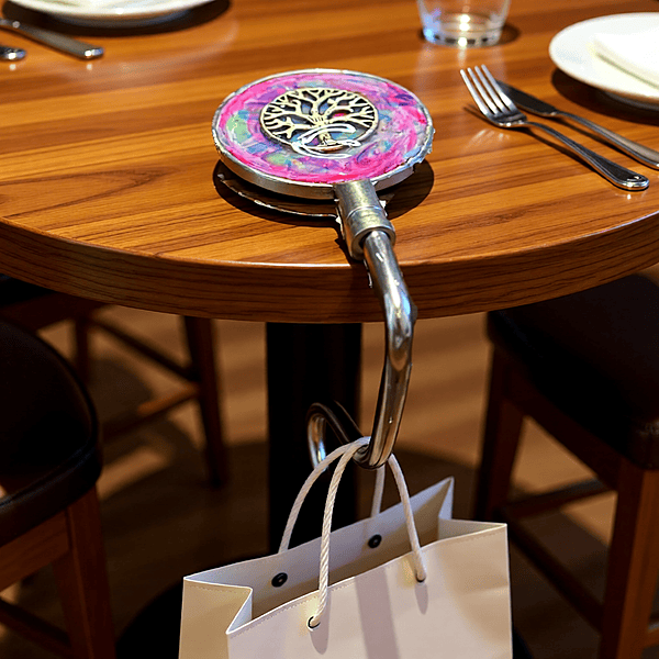 This nifty hook is more than just a stylish statement — it’s your purse's new best friend. Slide it out and watch as heads turn, your bag suspended in grace, while anything from spilled drinks to curious feet stays firmly away. Crafted with love and precision, each piece is a one-of-a-kind treasure, allowing you to flaunt a bit of artistry wherever you go. It’s portable — you can stow it in your purse, ready to shine at coffee shops, restaurants, or even that wild picnic you’ve been planning.