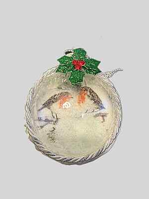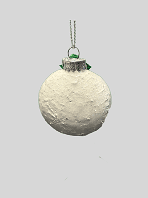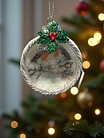 Encircled with a shimmering silver cord, this hand-crafted ornament sparkles like the first frost at dawn, adding a playful touch to your holiday decor. Lush, sparkling holly leaves burst forth in vibrant greens, like tiny emeralds dancing in the festive glow. Its back gleams in a pristine white, reminiscent of freshly fallen snow, wrapping your tree in elegance and joy.