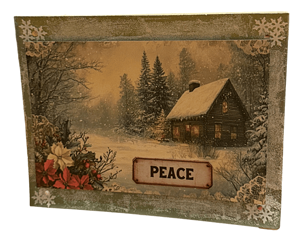 Imagine the cabin wrapped in a calming quilt of snow, each flake a tiny miracle. With “Peace” printed in its heart, this card cradles your sentiments and wraps them in warmth, like a snug scarf on a frosty day.