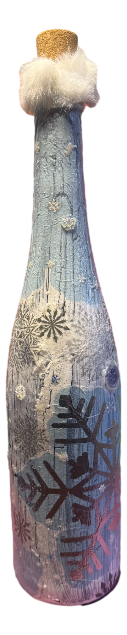 Imagine a cozy winter evening where the stars dance in your bottle — this frosty delight fills your space with shimmering blue and silver snowflakes, all tucked under a fluffy, snowy cap. Perfect for igniting holiday magic!