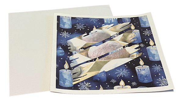 Dive into a frosty wonderland where shimmering blue snowflakes dance with candlelight, inviting you to unwrap the warmth of joy! The card is a secret portal, revealing the sweet aroma of Christmas cookies peeking through the ripples of a winter wonder. This isn't just a card — it's a handmade hug in an envelope, whispering festive cheer!