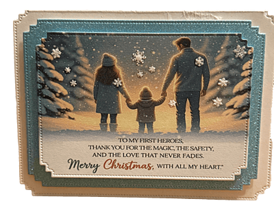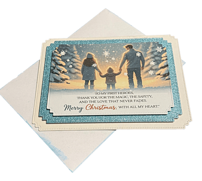 Picture this: A family wrapped in the winter's embrace, their laughter mingling with the delicate dance of snowflakes. This card captures those precious moments — like glittering gems scattered across a white canvas. Every glance invites warmth into the chilly air and whispers, “May your holidays echo with joy and heartfelt memories!”