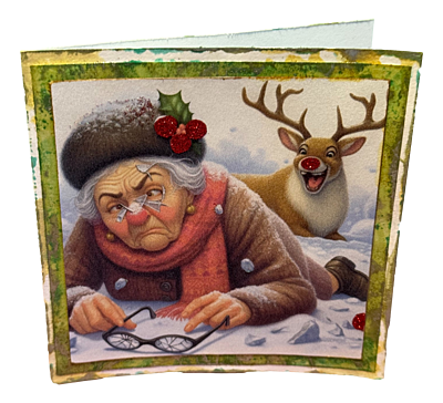 Cuddle up to a heartwarming scene where snowflakes dance like tiny stars, and Grandma, the star of the show, finds herself in a giggly entanglement with a jolly reindeer. This card is more than just a festive greeting; it’s a cheeky promise of holiday chuckles and a sprinkle of magic that'll take your loved ones on an unforgettable winter's journey!