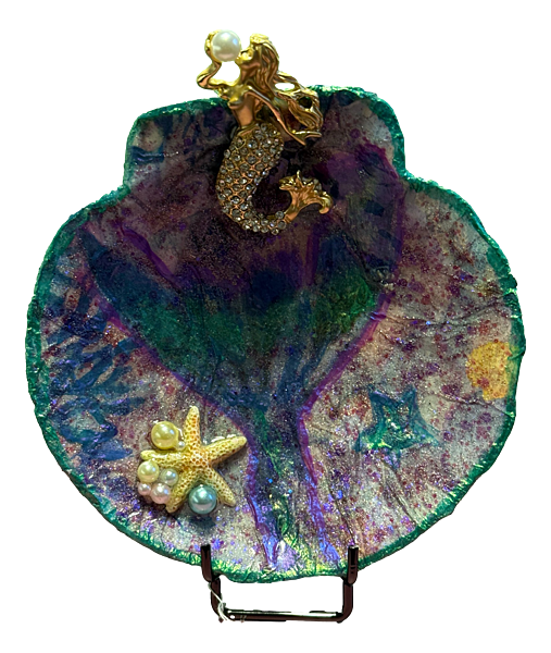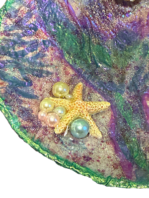 Plunge into a fantasy where trinkets aren’t just stored; they’re celebrated! This mermaid-touched scallop shell beckons you with its soft purple sparkle and whimsical adornments. Curvy starfish and glimmering bubbles frolic around, all while a gold-tone beauty winks from amidst the treasures. Why settle for ordinary when you can showcase your flair in this exquisite shell of dreams?